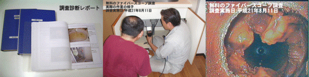 ファイバースコープ調査は無料で実施できます。あなたの水道メーターの所でメーターを外して管内をファイバースコープで覗く調査が1世帯(1戸)1箇所無料です。しかもファイバースコープの写真を掲載した報告書も提出します。