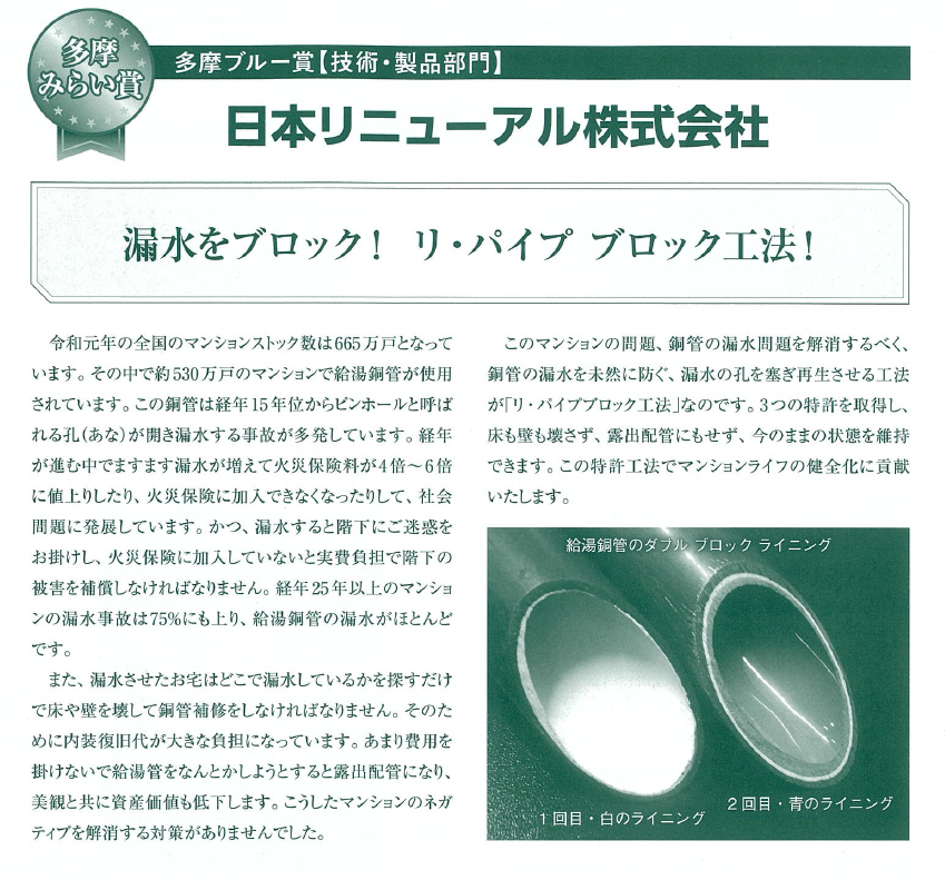 給湯銅管更生工事・リ・パイプブロック工法開発元!