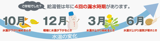 気温の変化の大きい、秋から冬の初め、春から初夏にかけて漏水の危険性が高まります。