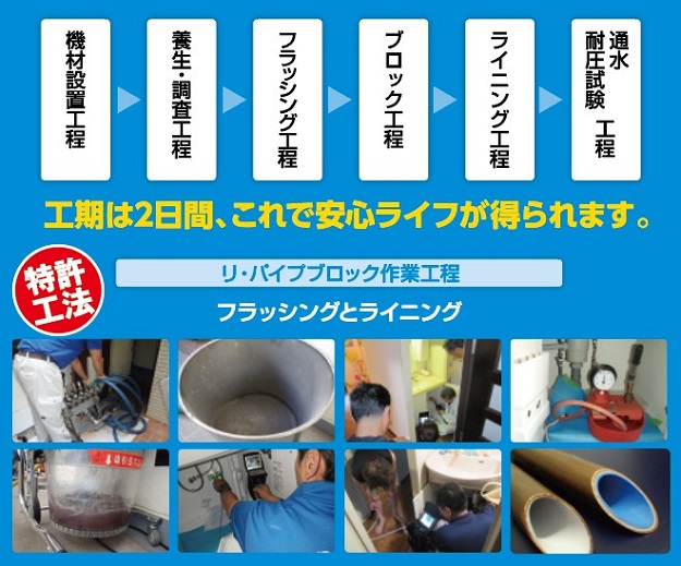 「特許工法のリ・パイプブロック工法」なら、お宅の床も壊さない、壁もそのままで漏水を止めます。